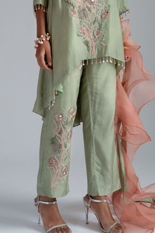 Sage Green Silk Mul Mul Sequins Embroidered Kurta Set