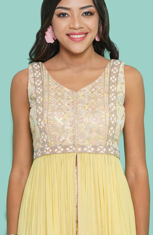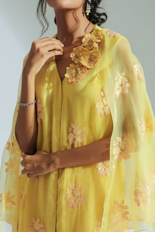 Yellow Organza Floral Motifs Embroidered Tunic Set