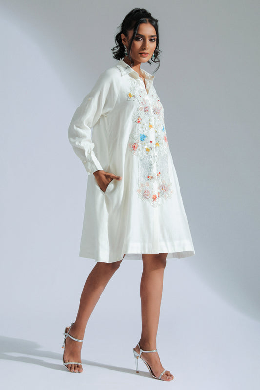 White shirt dress with intricate lace, beadwork, and charming motifs.