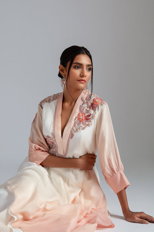 Off-White & Champagne Ombre Silk Mul Mul Floral Motifs Embroidered Kaftan