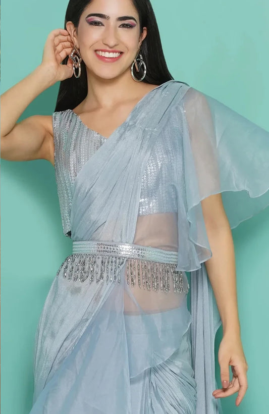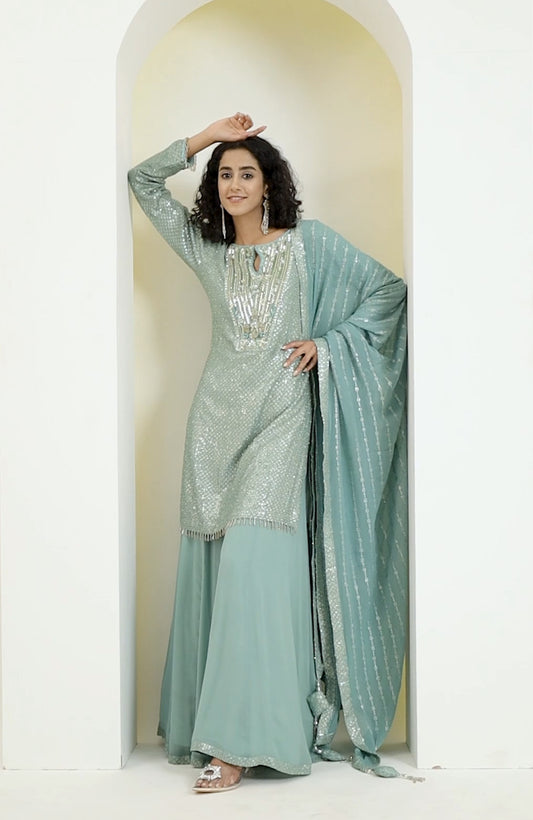 Aqua blue sequinned shirt , embellished with embroidery, dupatta and sharara