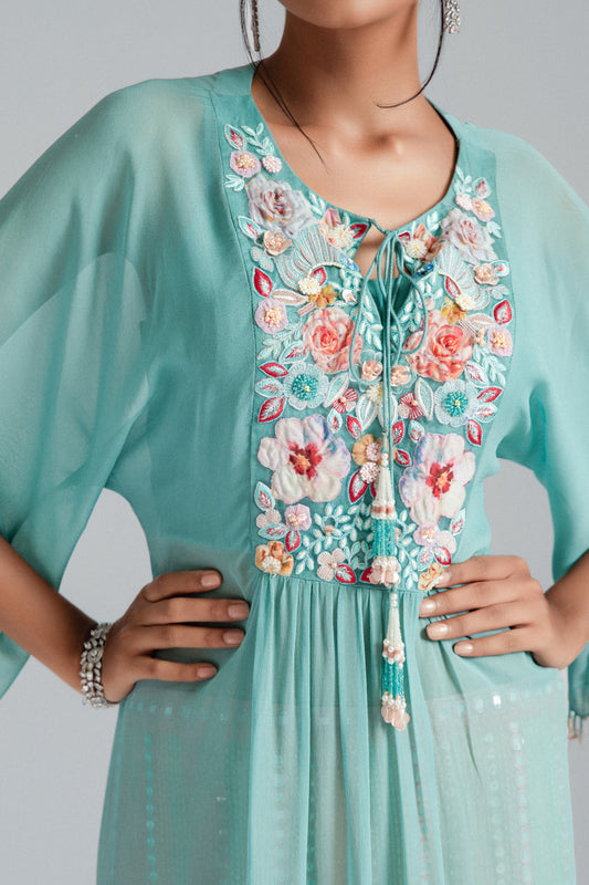 Aqua Blue Silk Mul Mul Thread Embroidered Tunic Set