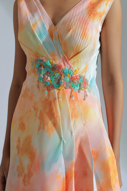 Multi-Colored Pleated Crepe Fabric Sequins Embroidered Overlap Maxi Dress