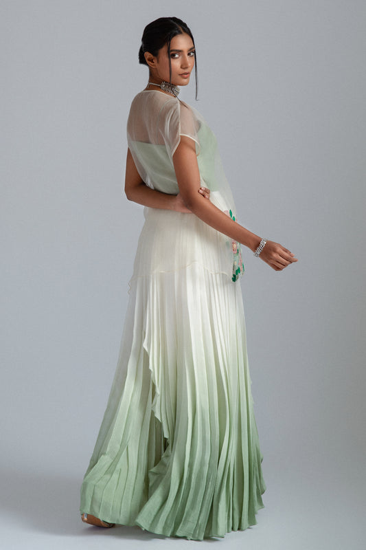Off-White & Sage Green Ombre Silk Mul Mul Skirt Set