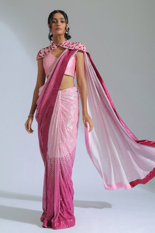 Light Pink & Fuchsia Pink Georgette Pre-Draped Saree Set